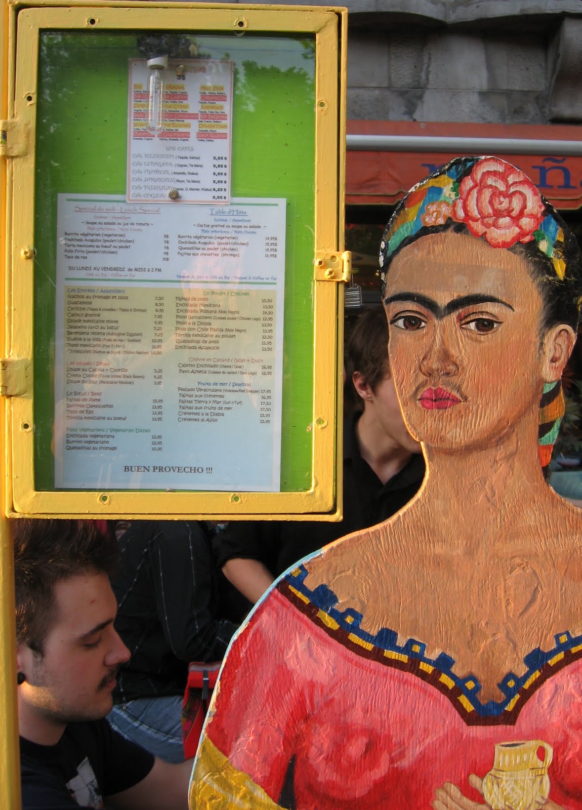 FOR MORE INFO: Wikipedia's Frieda Kahlo; Lisa Rogers writes of the suicide of Dorothy Hale, on of Kahlo's more controversial works. Lisa also wrote of Kahlo's "Broken Column" at Prisoner in a corset. Actually, she's penned many well written items about Frieda Kahlo. Well worth the visit. | The image on the right is a sign in front of a Mexican restaurant, "Manana" in Montreal PQ, Canada. 605 Rue Ste-Denis.